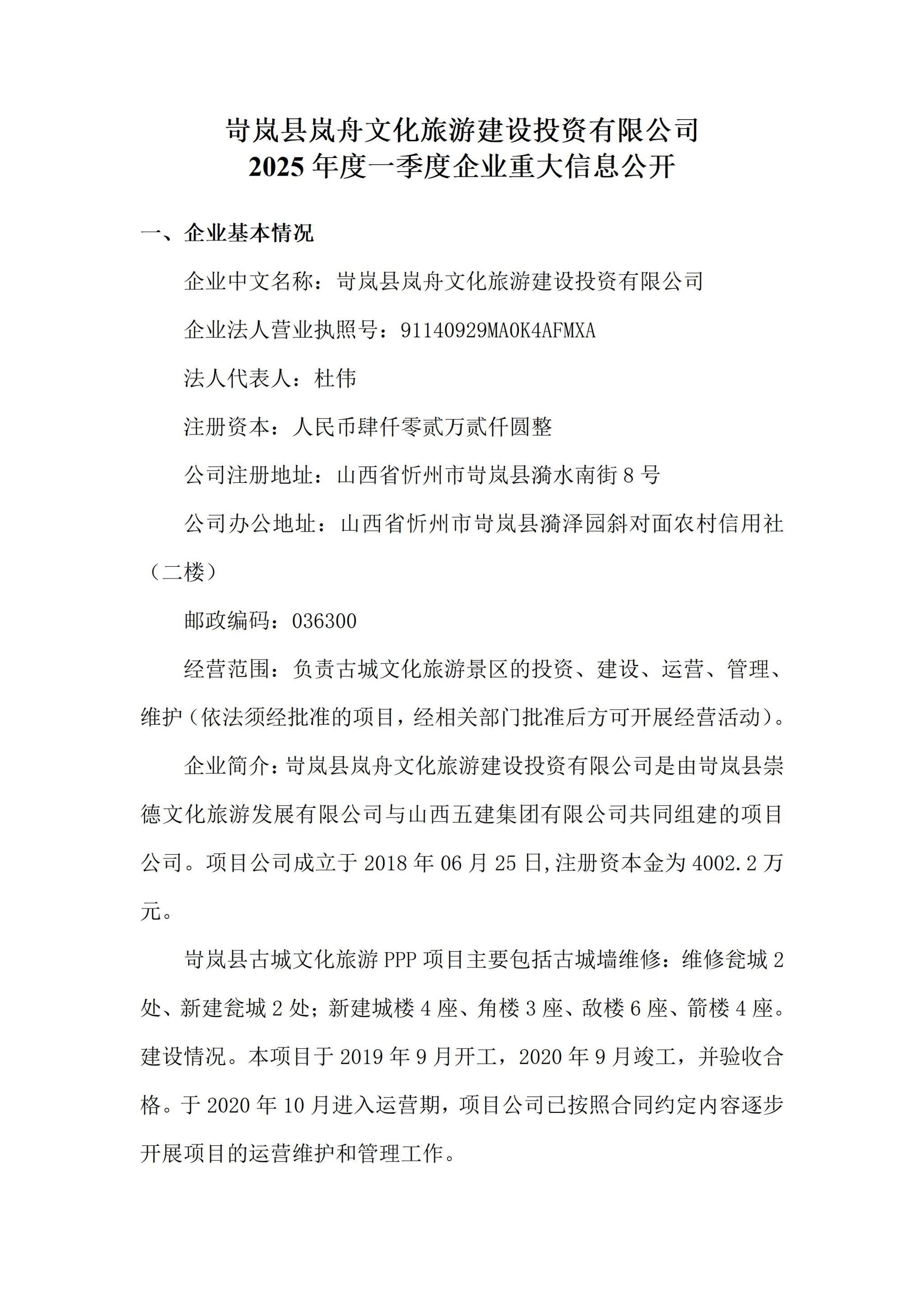 岢岚县岚舟文化旅游建设投资有限公司2025年第一季度企业重大信息公开