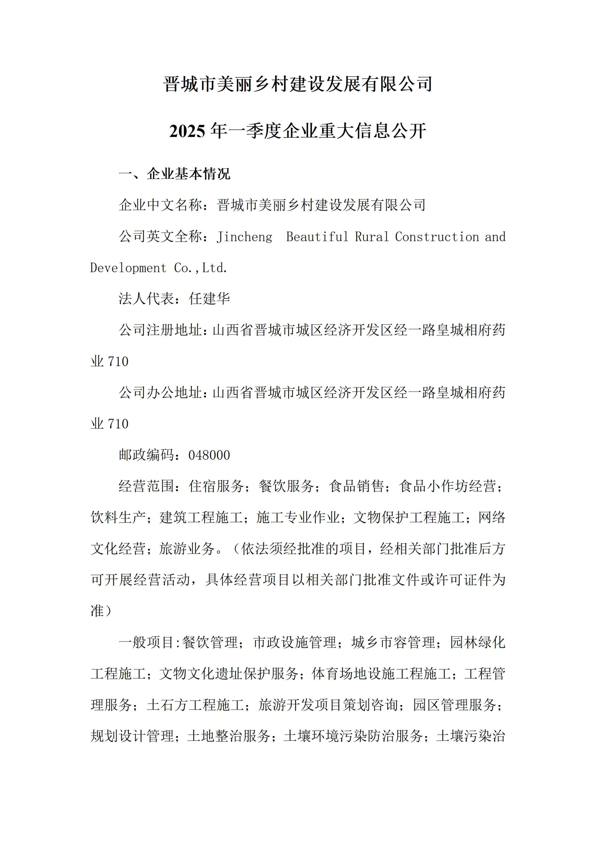 晋城市美丽乡村建设发展有限公司2025年一季度企业重大信息公开