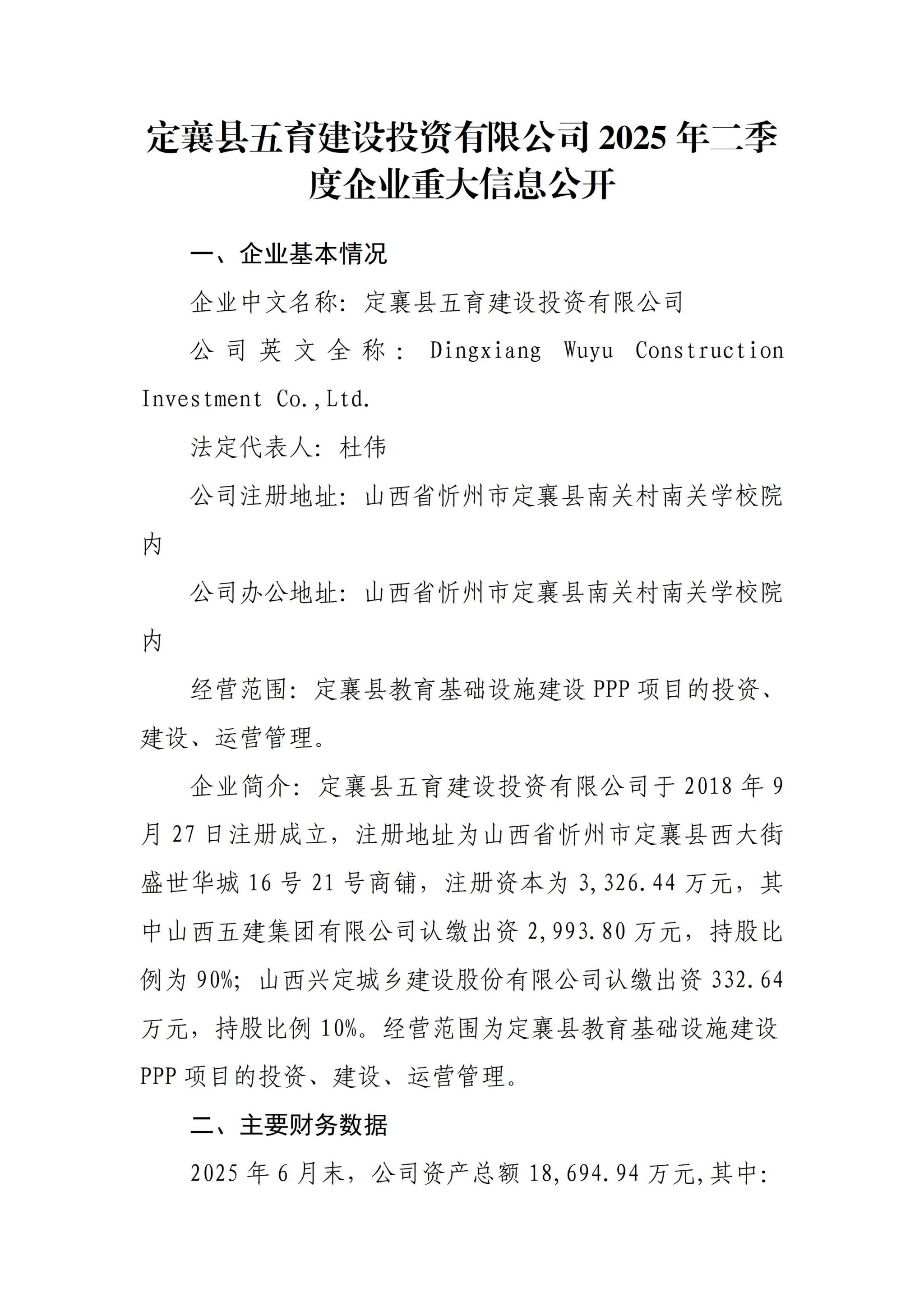 定襄县五育建设投资有限公司2025年二季度企业重大信息公开