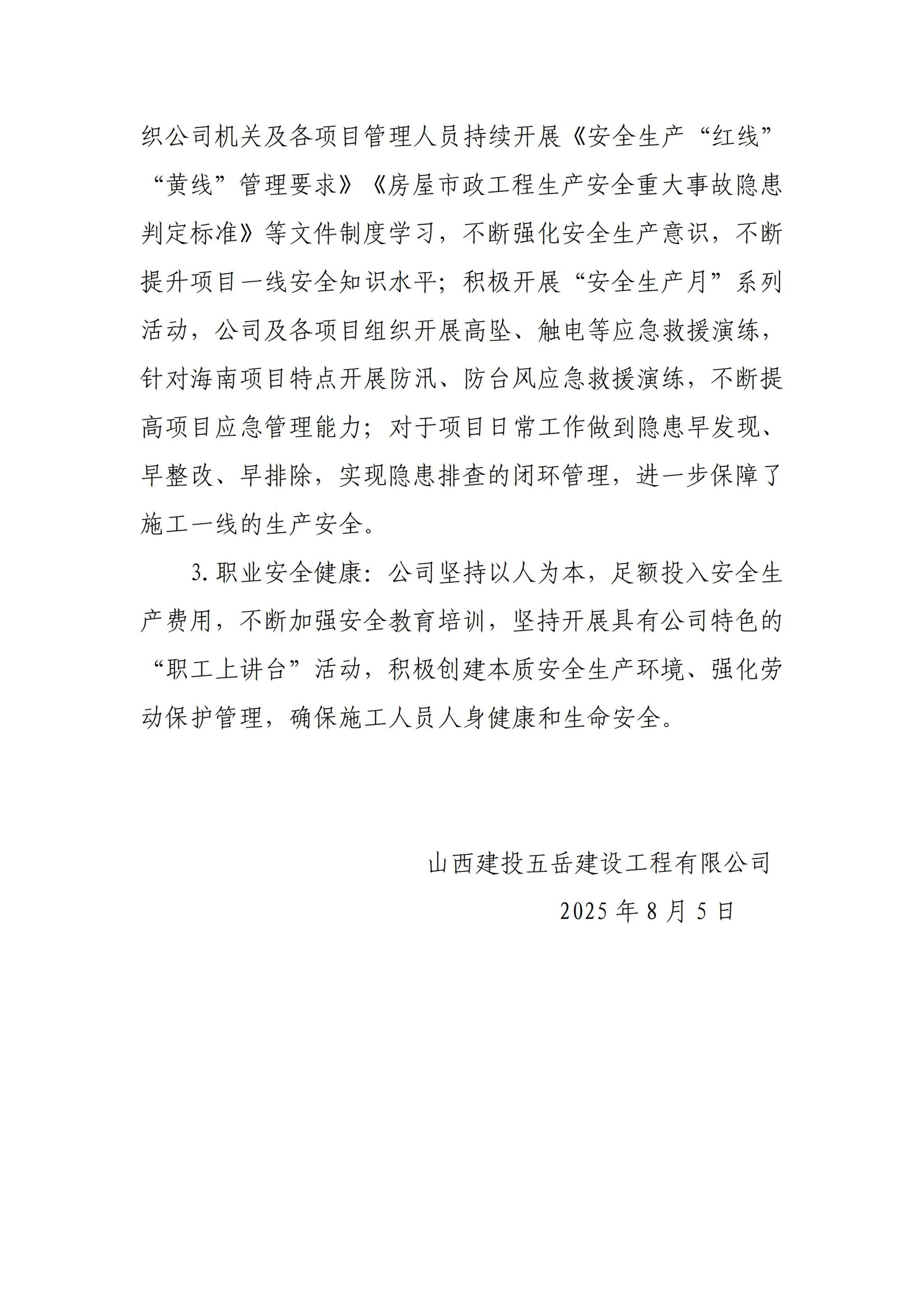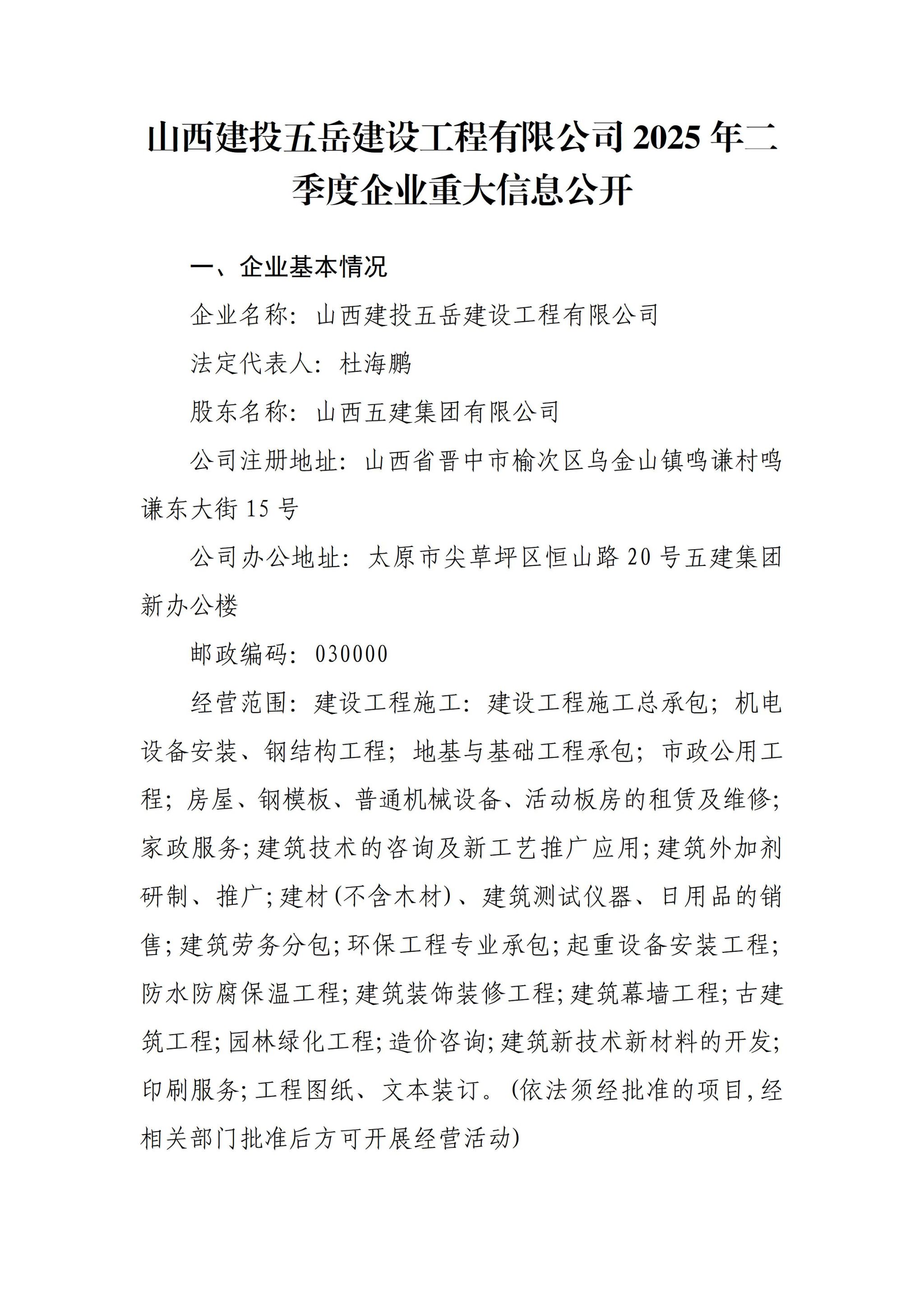 山西建投五岳建设工程有限公司2025年二季度企业重大信息公开