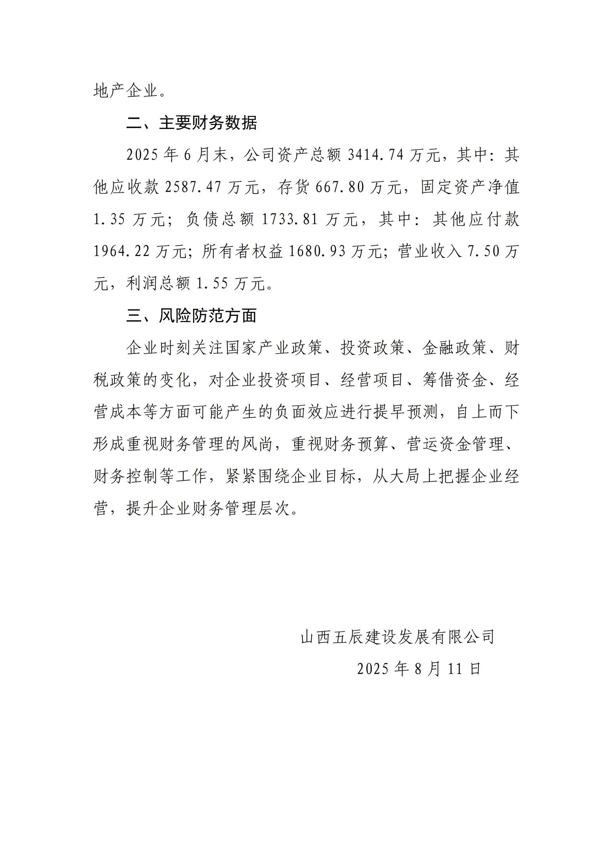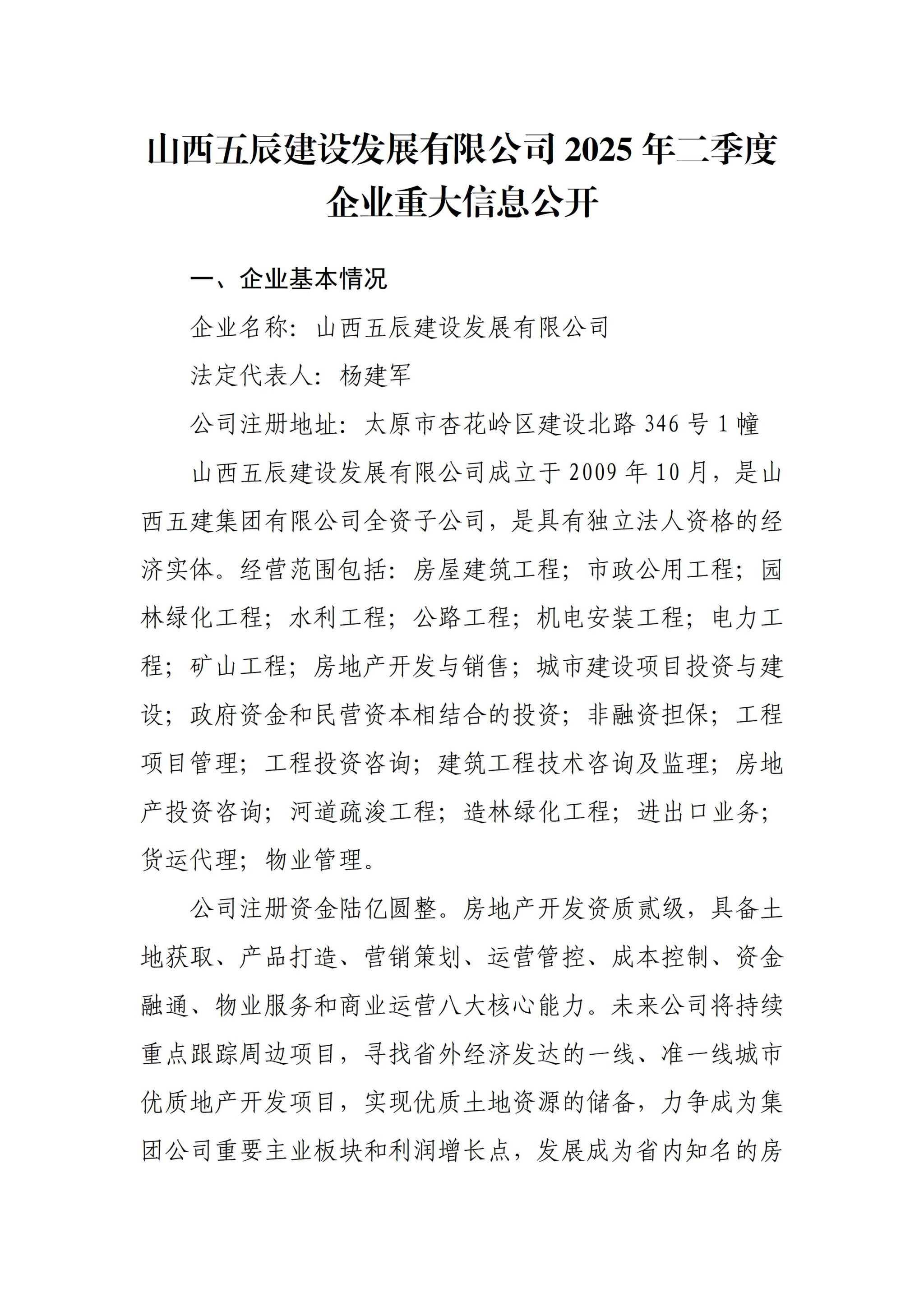 山西五辰建设发展有限公司2025年二季度企业重大信息公开