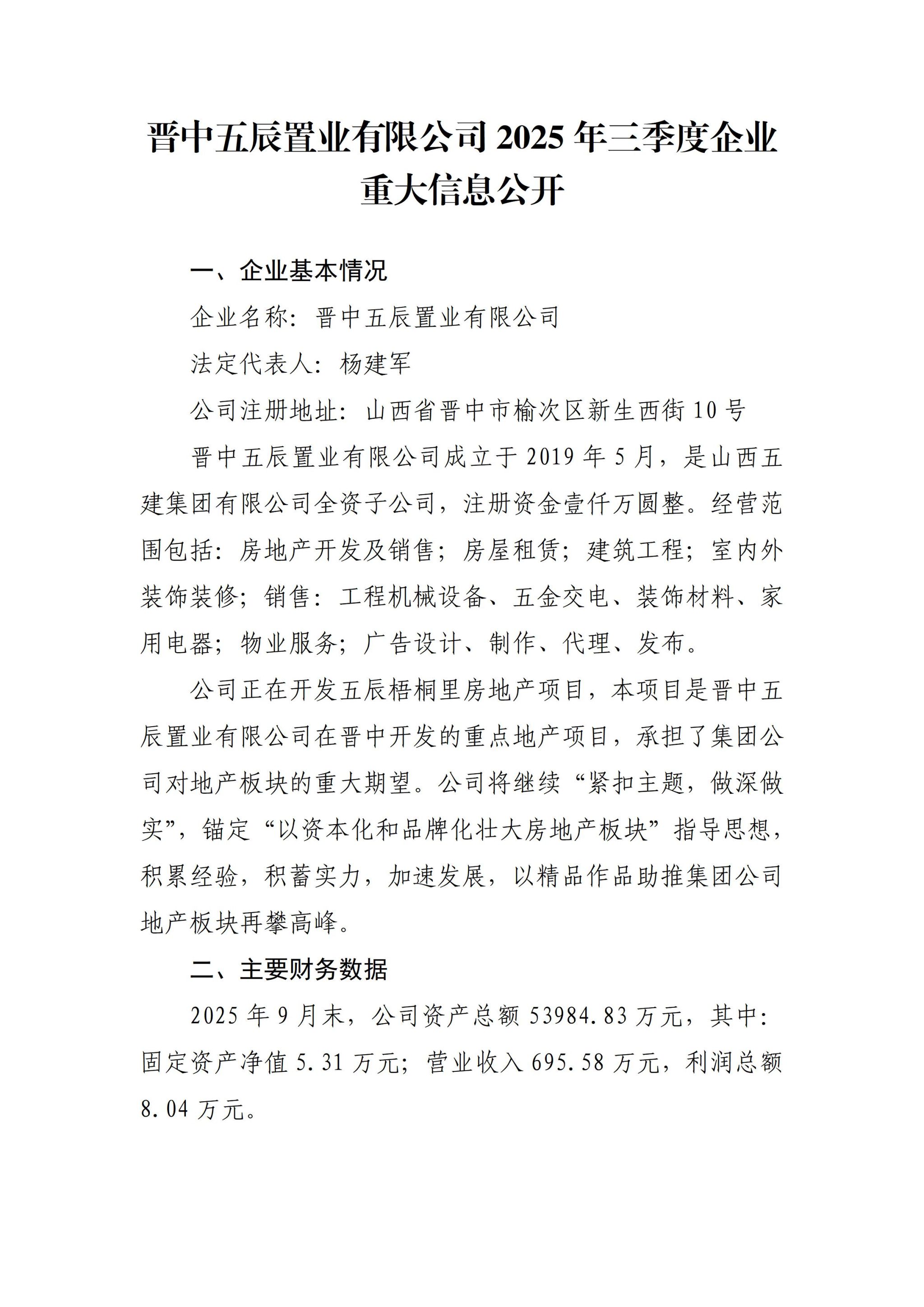 晋中五辰置业有限公司2025年三季度企业重大信息公开