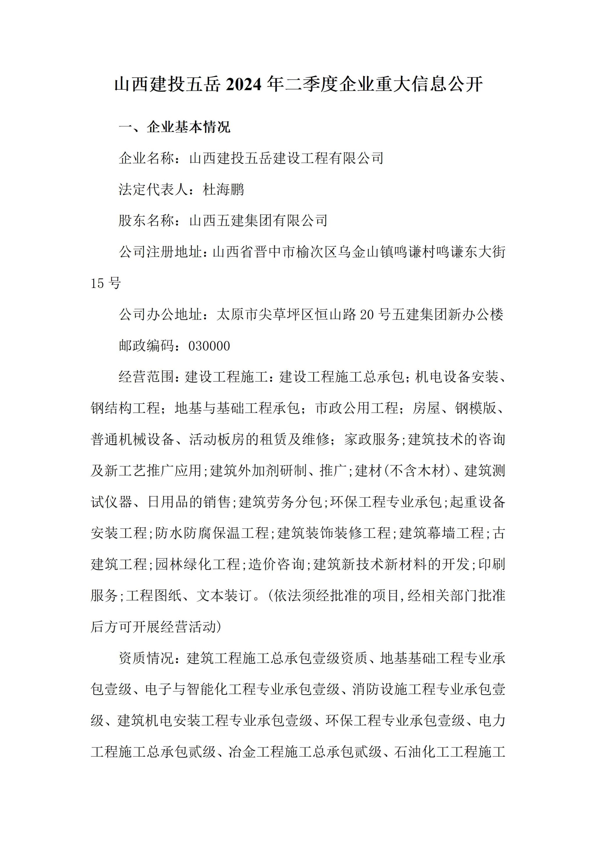 山西建投五岳建设工程有限公司2024年二季度企业重大信息公开