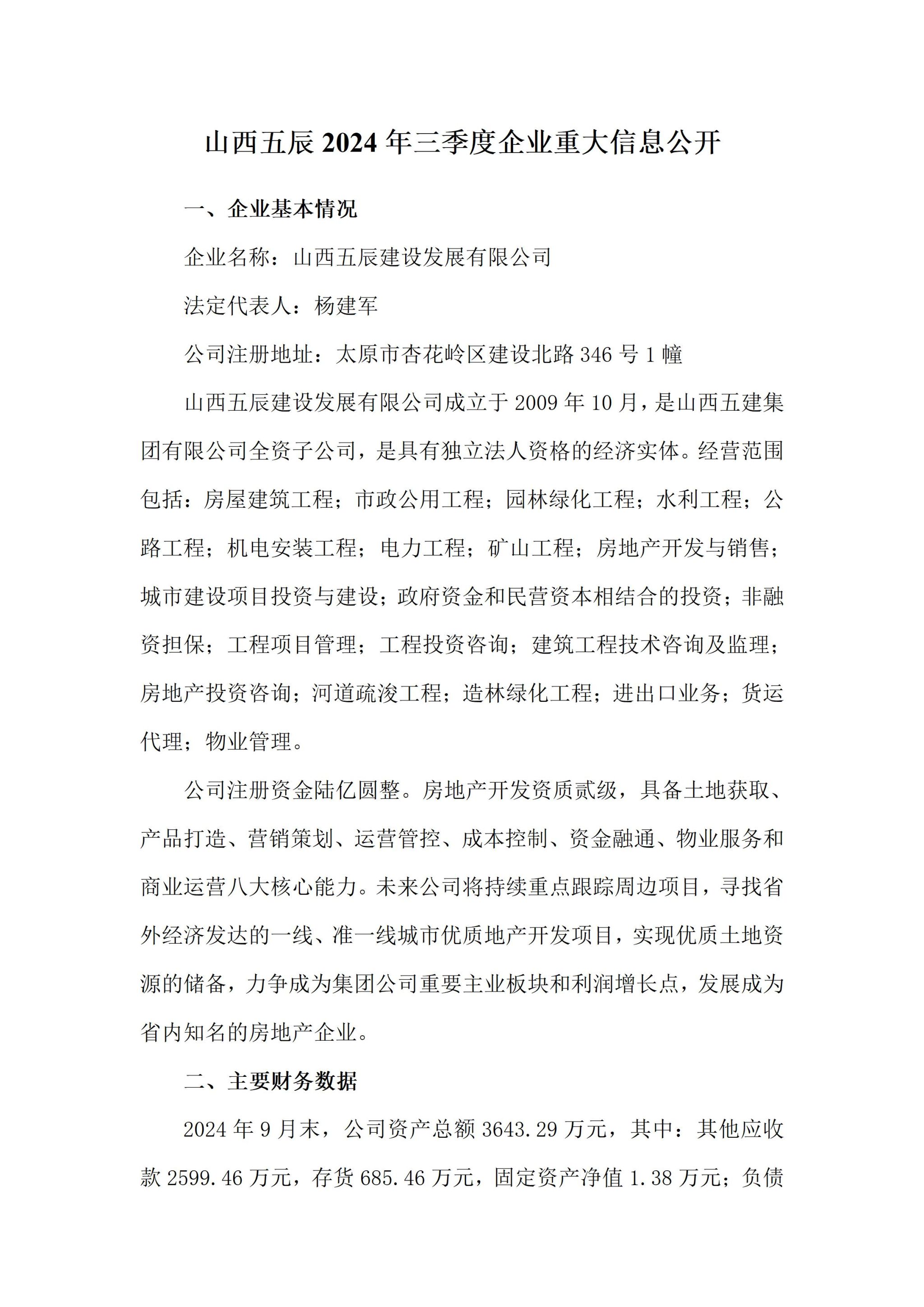 山西五辰建设发展有限公司2024年三季度企业重大信息公开