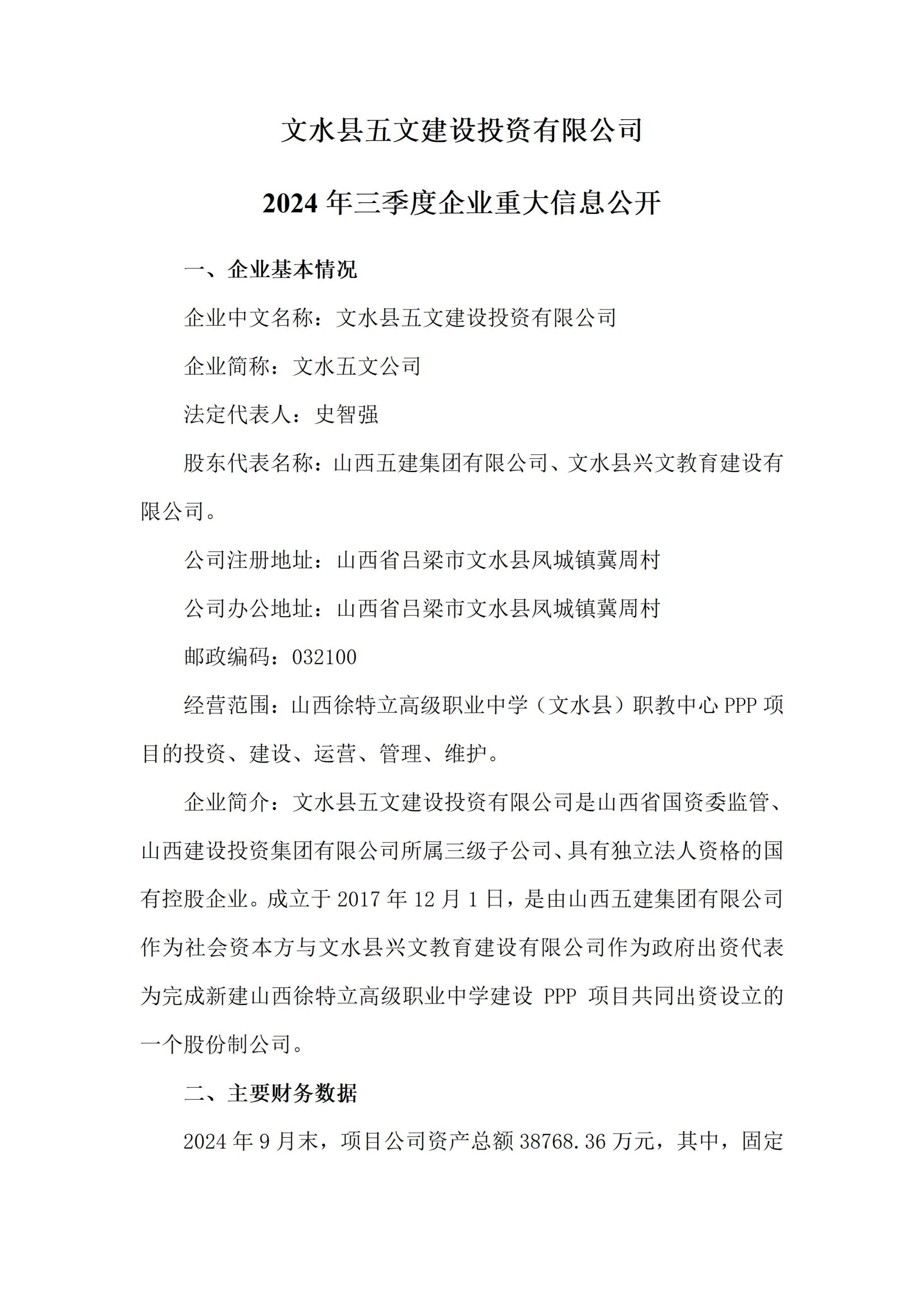 文水县五文建设投资有限公司2024年三季度企业重大信息公开