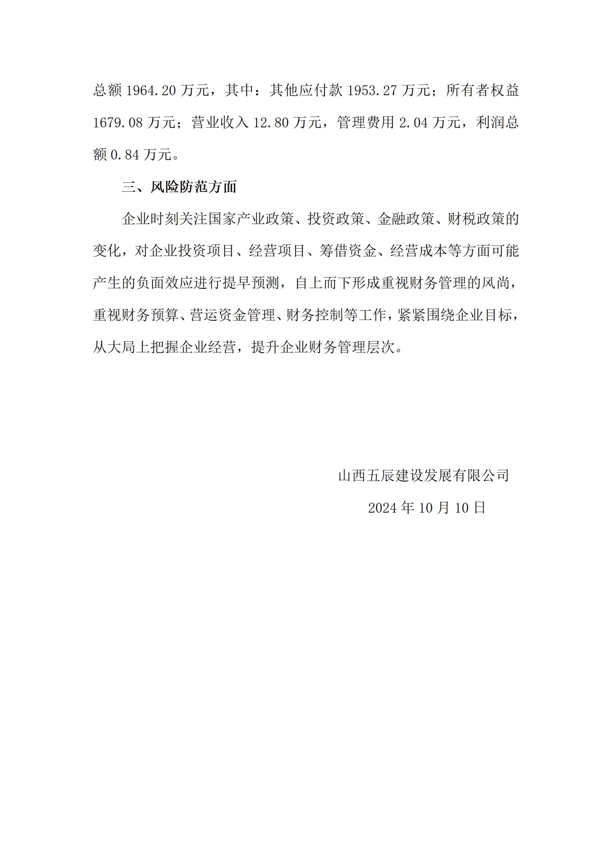 山西五辰建设发展有限公司2024年三季度企业重大信息公开